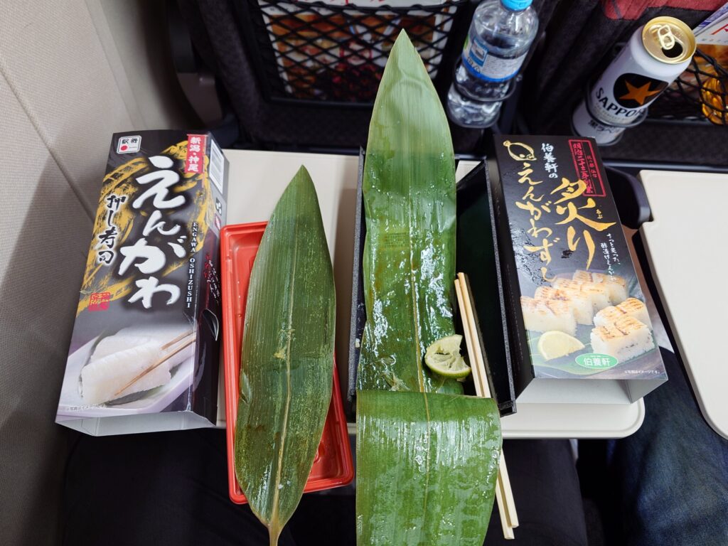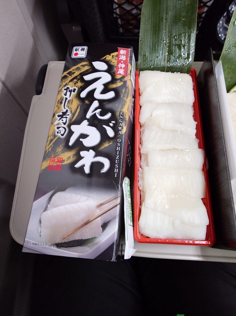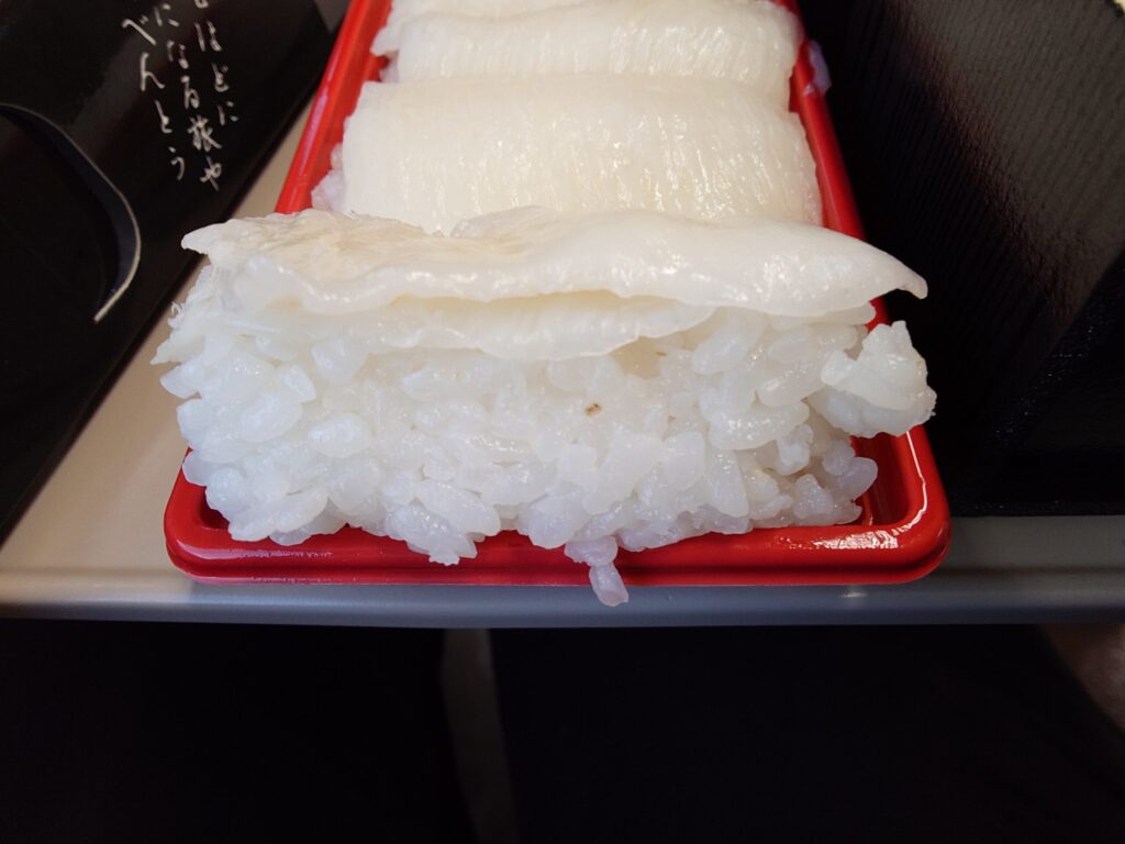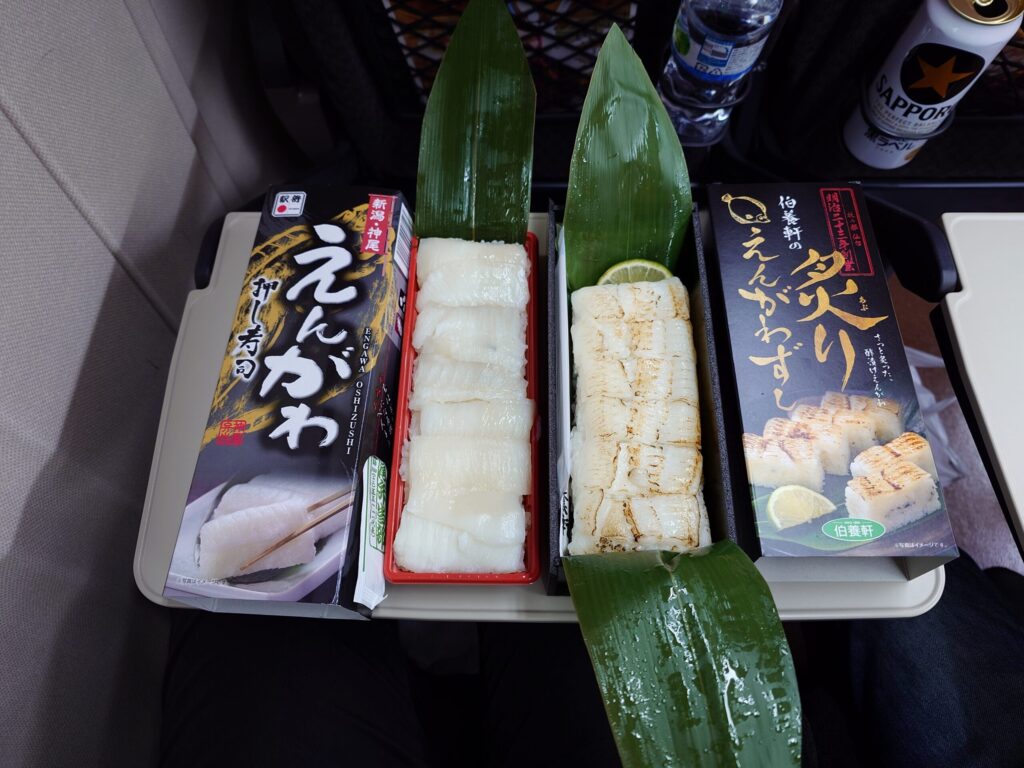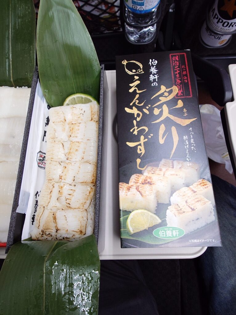 東京駅の駅弁屋祭で、事前に友人からオススメされていたえんがわ押し寿司(1680円)と、たまたま見つけた伯養軒の炙りえんがわずし(1780円)を購入し、ノーマルと炙りの2種類のえんがわ寿司を食べ比べ。