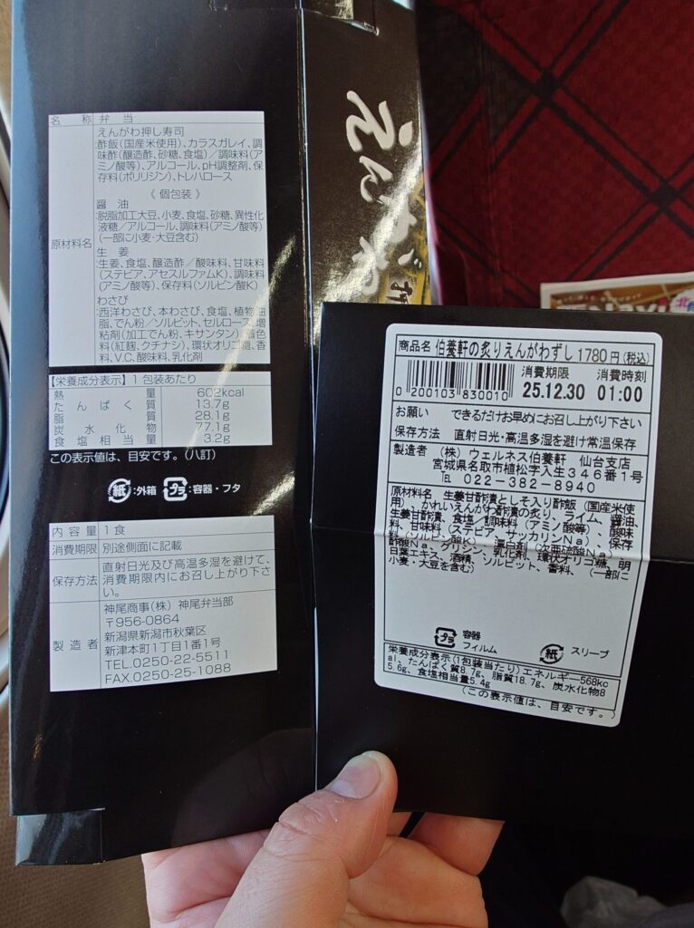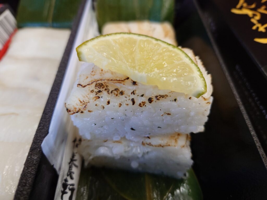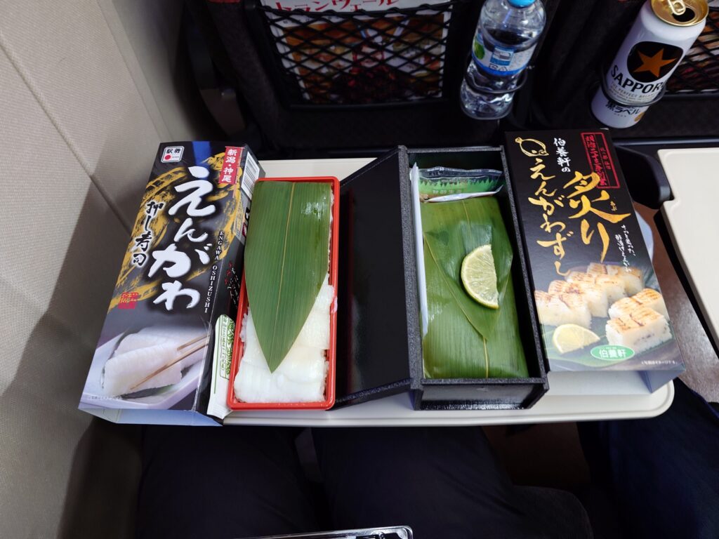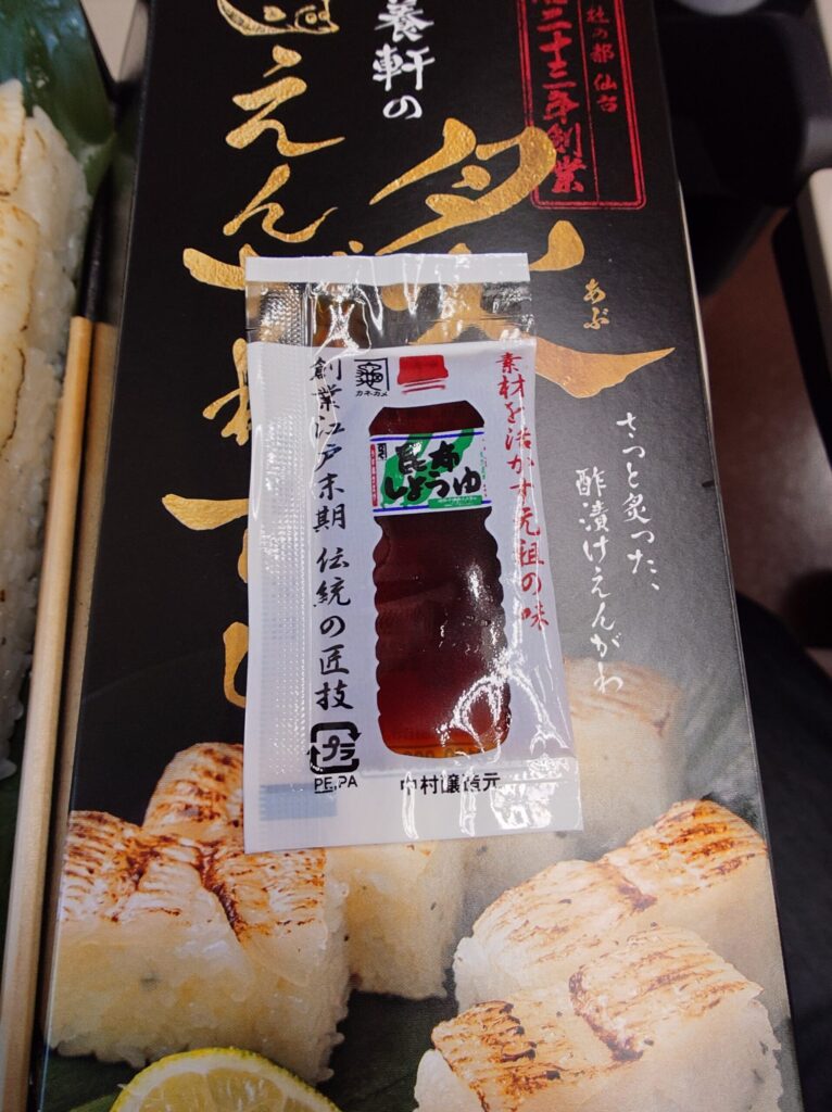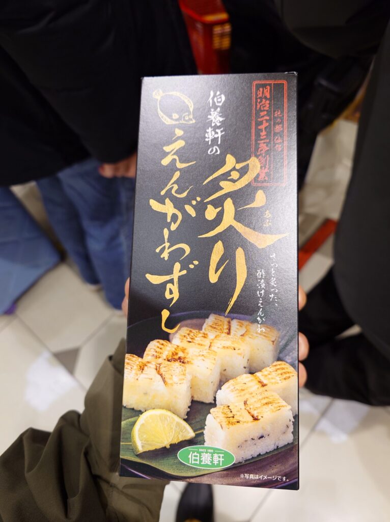 東京駅の駅弁屋祭で、事前に友人からオススメされていたえんがわ押し寿司(1680円)と、たまたま見つけた伯養軒の炙りえんがわずし(1780円)を購入し、ノーマルと炙りの2種類のえんがわ寿司を食べ比べ。