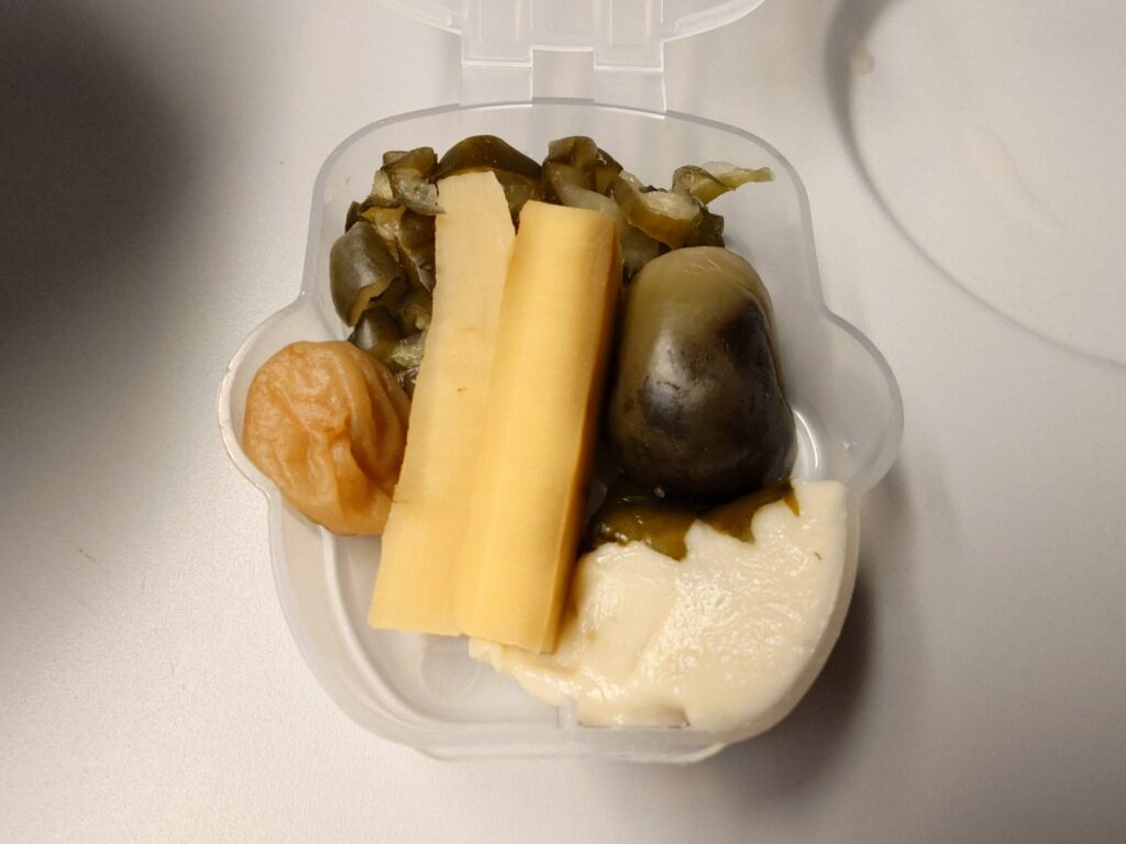 プラスティック容器に入った漬物は、ごぼう・きゅうり・なす・梅干し・わさび漬けが入っています。どれも塩味が強めでご飯にも合いますが、これは非常に酒が飲みたくなってくる味です。