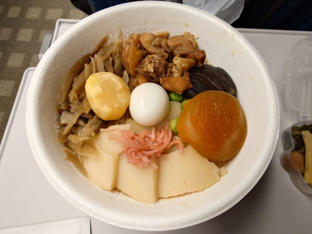 新幹線が東京駅を出発し12時前くらいになったので、購入した峠の釜めし(1400円)を食べたいと思います。