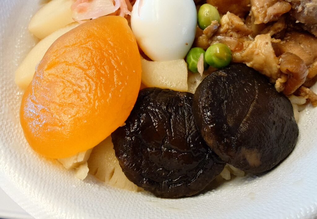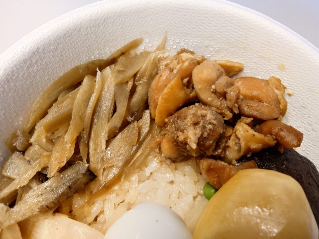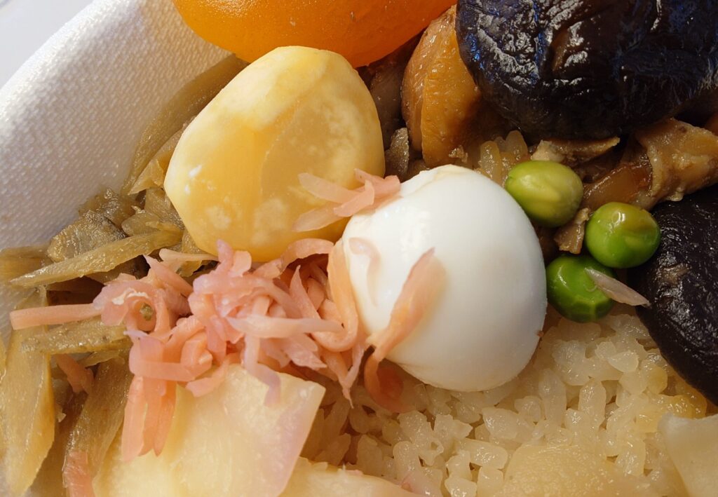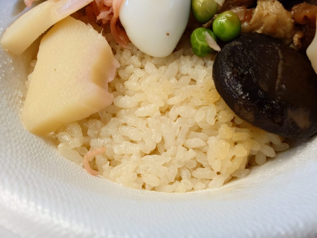 峠の釜めしは陶器の入れ物に入っているイメージですが、祭で売られているのはプラスチックの容器に入っている物でした。陶器のやつはこれぞ峠の釜めしという感じで味があって良いんですが、重いのと捨てる時めんどくさいのがネックなので、軽くて持ち運びしやすくて捨てやすいプラスチック容器で助かりました。