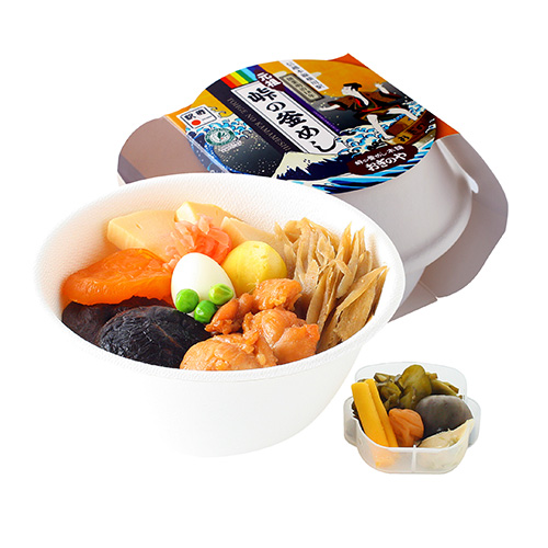 蓋を開けて広げてみるとこんな感じ。釜めしと漬物がセットになっています。