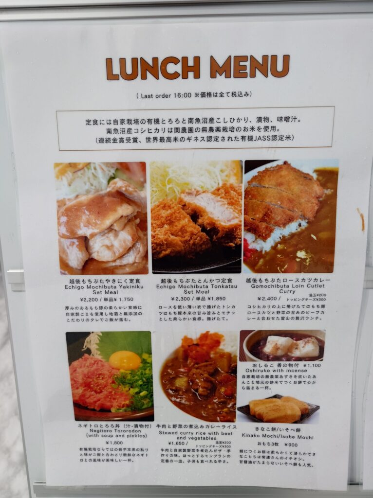 こちらはメインのフードメニュー。越後もちぶたを使った焼肉定食やとんかつ定食、カレーやネギトロとろろ丼などがあります。ちなみに、こちらのお店の米は「米・食味分析コンクール」という大会で金賞を受賞した南魚沼産コシヒカリを使っているそうです。