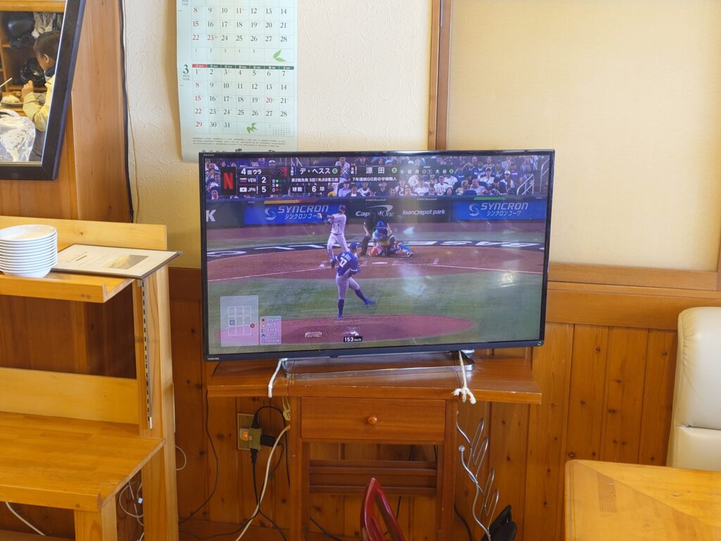 この日はちょうど2026WBCの日本VSベネズエラ戦の日。店内奥にあるTVでネットフリックスによる中継が放映されていました。食券を購入したので、呼ばれるまでWBCを観てしばし待つ。