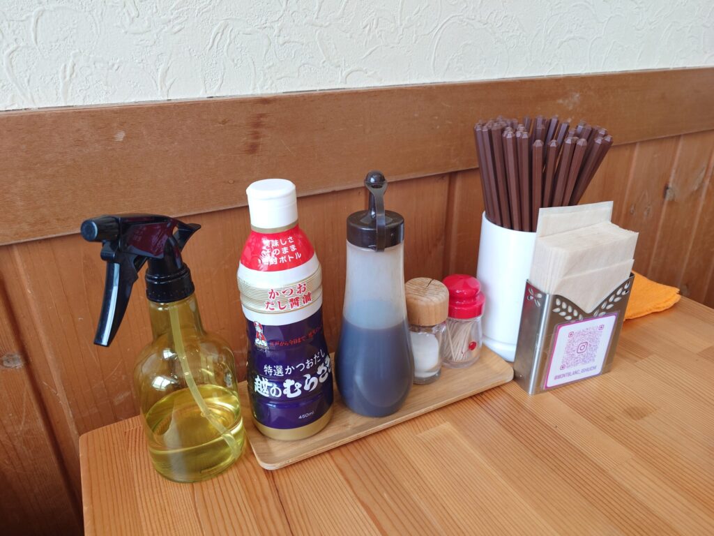 テーブルには醤油・ソース・塩などが設置。
