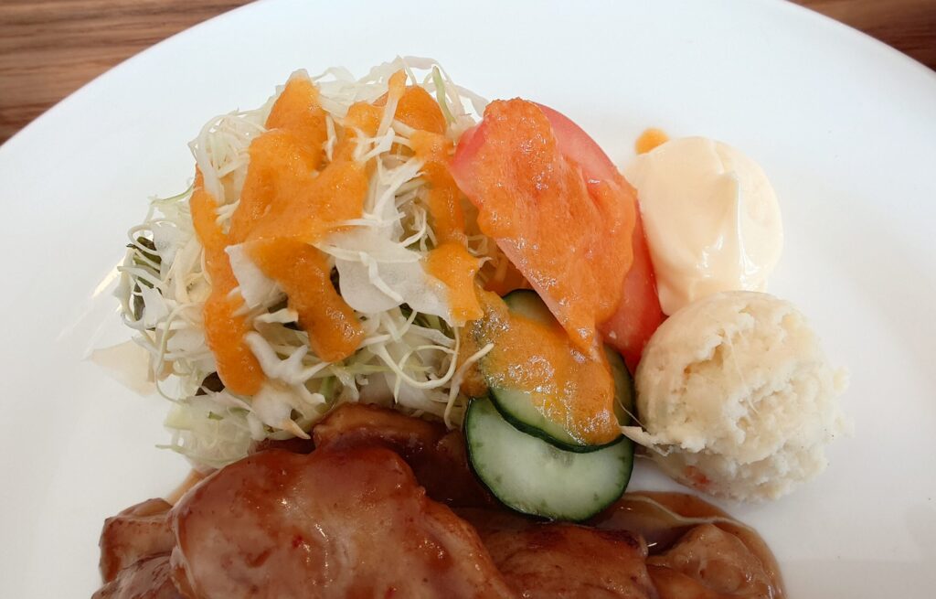 付け合わせの野菜は千切りキャベツにきゅうりとトマト、ポテトサラダが付いています。ポテサラは玉ねぎの食感と風味が強くて手作り感がある。野菜はシャキシャキで新鮮。手作り感のあるにんじんドレッシングが美味しくて野菜に合う。