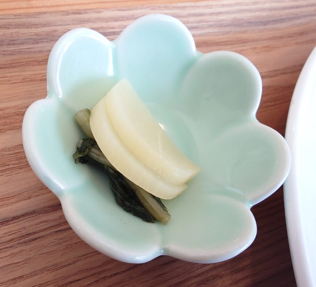 漬物は野沢菜とたくあん。ほのかに塩味の効いた非常にシンプルな味。こういうのが良いんですよ。