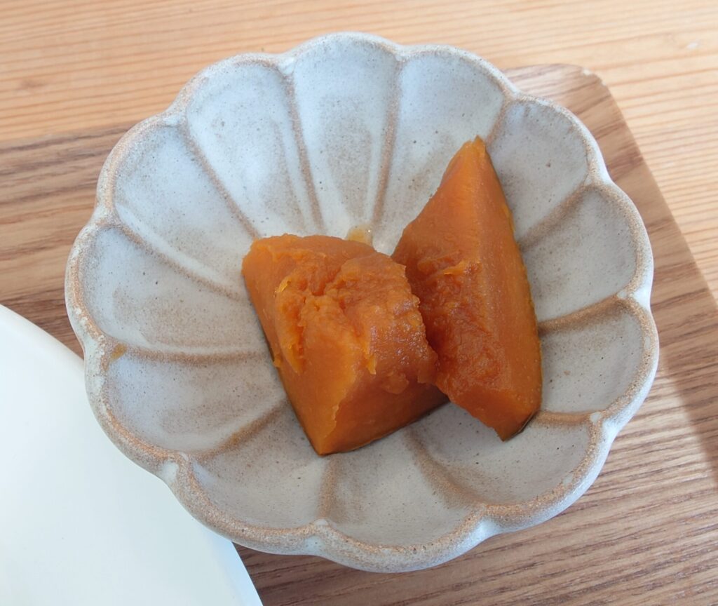 小鉢のかぼちゃの煮物。柔らかくてねっとり。甘めの味付けで、中までしっかり味がしゅんでる。