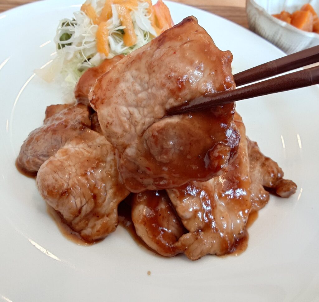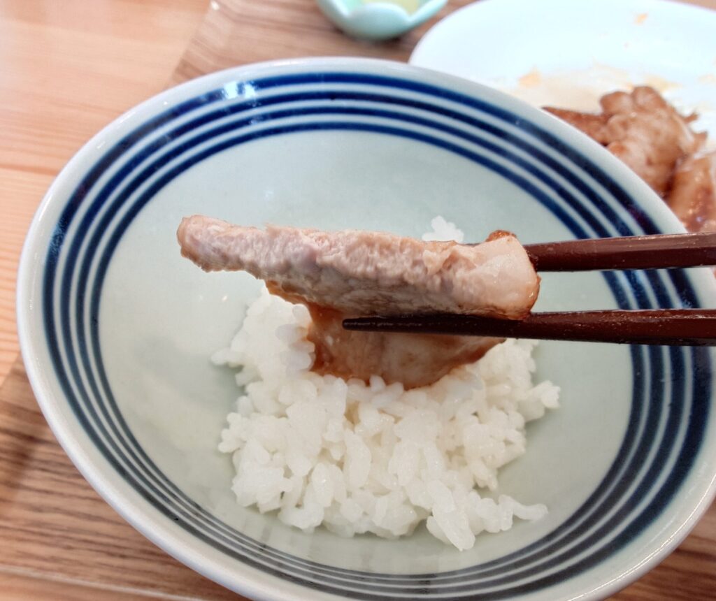 お肉は柔らかくてジューシー。食べてみると割りと肉厚。無添加のタレは醤油ベースでニンニクが効いており、トロミもあってお肉にしっかり絡む。もう抜群にご飯と合います。