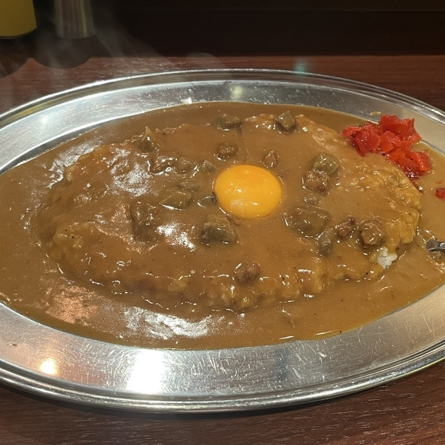 銀皿・銀スプーン・ドロッとしたルー・生玉子・トンカツ。見た目からしても大阪カレーらしい感じのカレーです。これは美味そうだ。