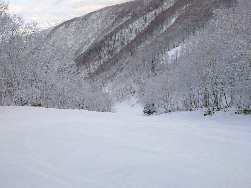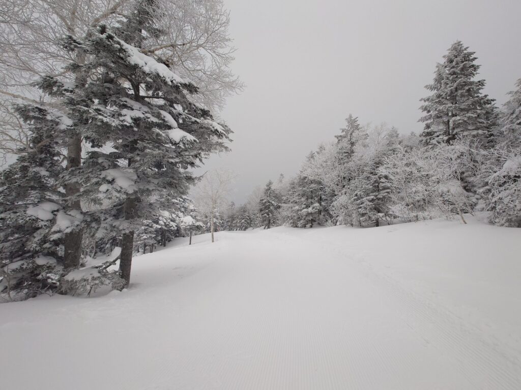 山麓と違って山頂エリアは雪質がガラリと変わって、サラサラで軽いパウダーが薄っすら積もっていました。ツリーランは深雪ではないものの底突きは無く、まずまずのコンディション。