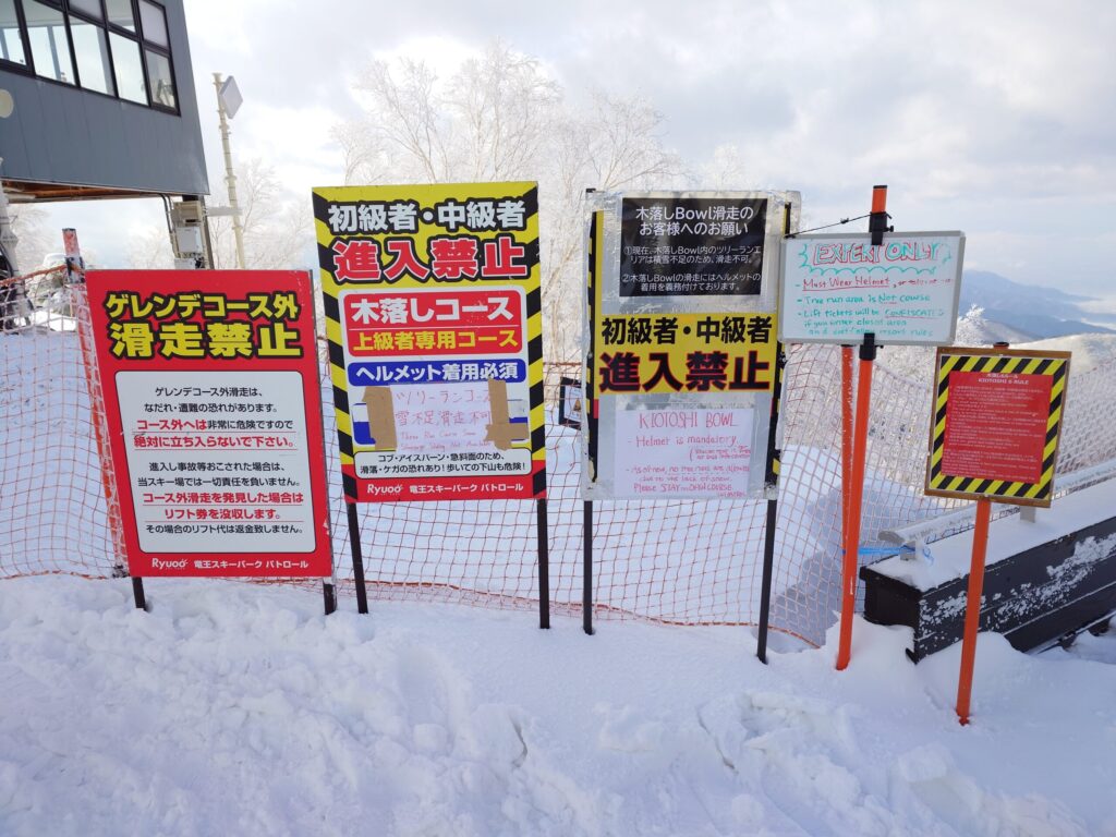 そして、そのテラスの下に広がるのが竜王の名物コース、「木落しコース」。非圧雪・急斜面が続く、ヘルメット着用必須な上級者専用の難コース。降雪があった場合は極上のパウダーが堪能できます。