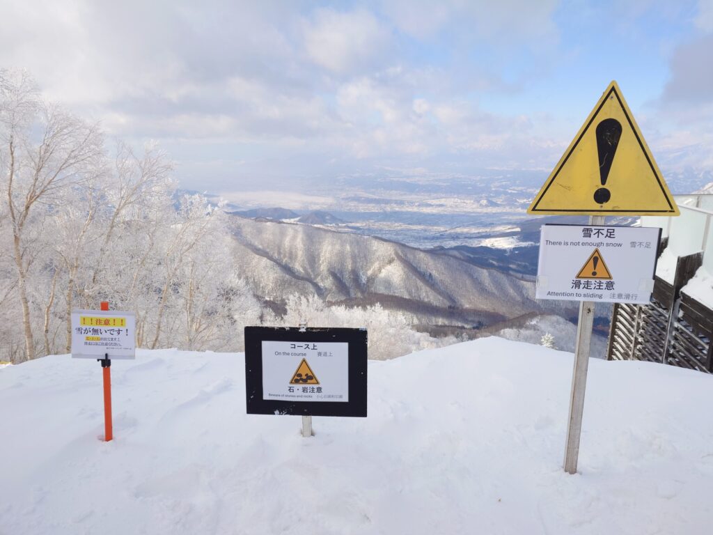 だがしかし!雪不足という注意看板がコース入口に設置!コース自体はOPENしていましたが、まさか雪が無いとは…。