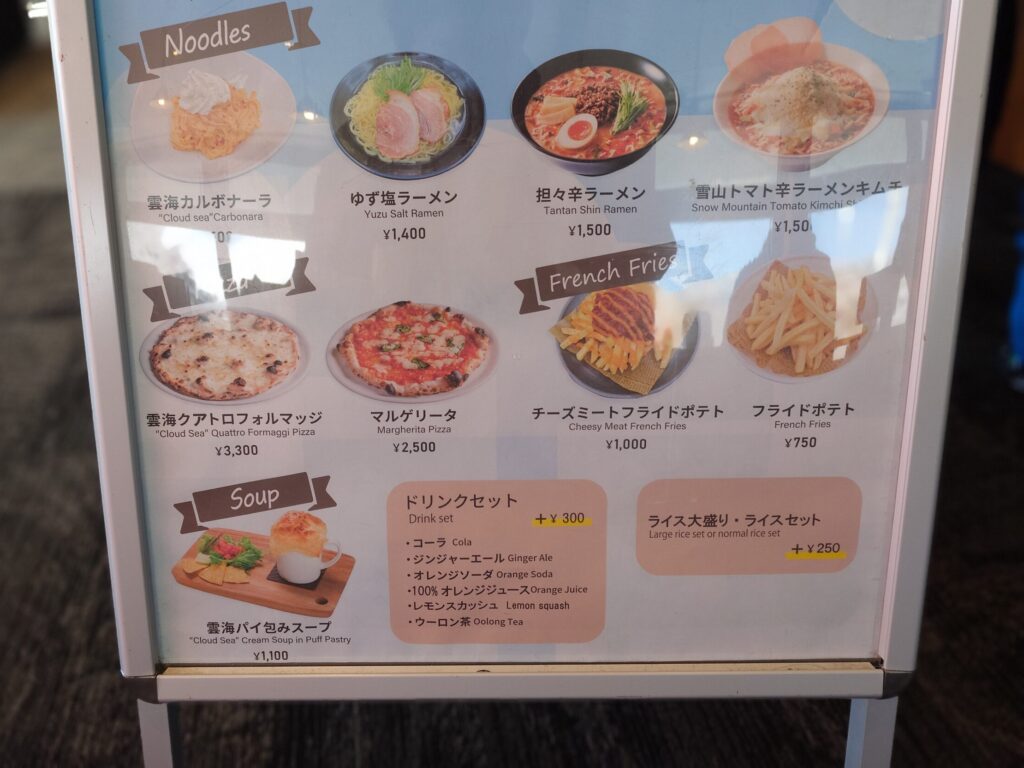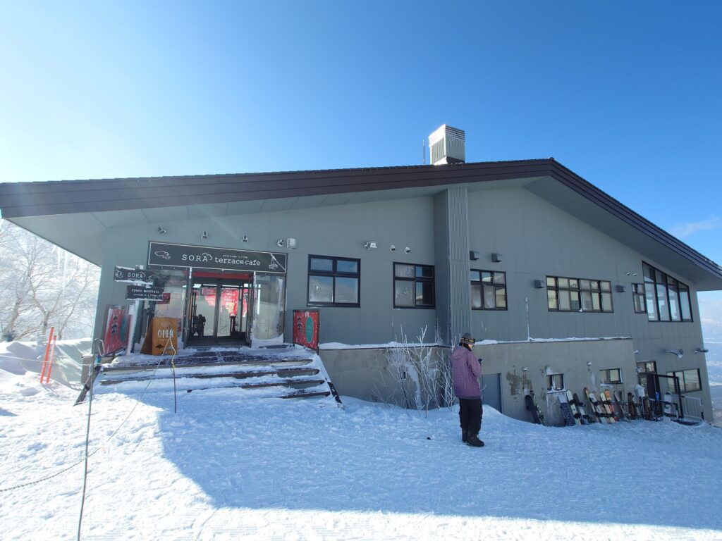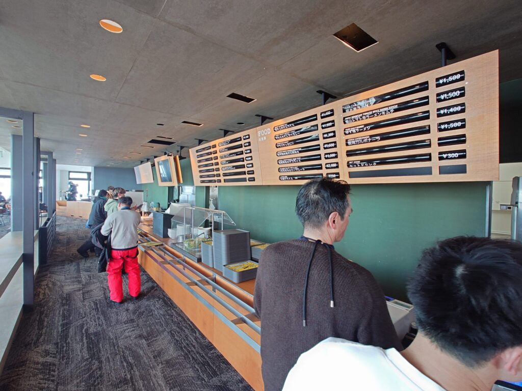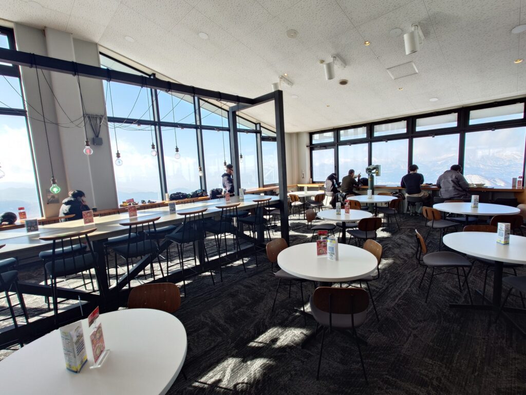 ボコボコの木落しコースを滑り降りるという苦行を行い、またロープウェイに乗ってロープウェイ山頂駅に戻ってきました。ちょうどランチタイムだったので、山頂駅付近にあるレストランでランチをすることに。