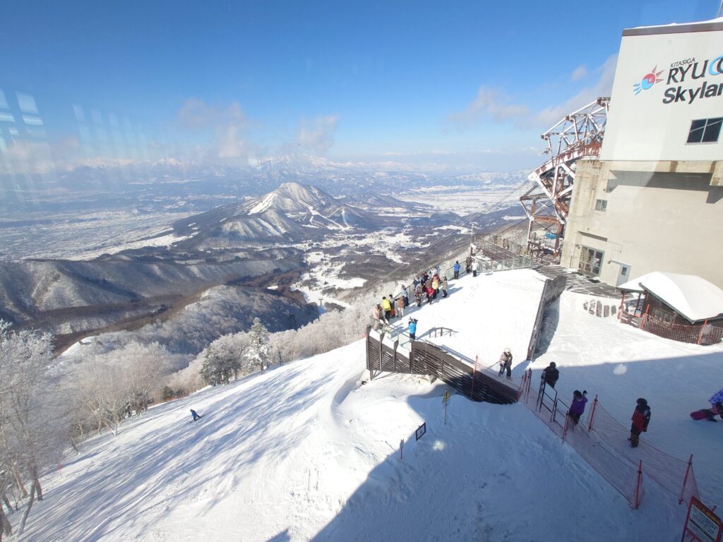 山麓エリアは硬めのバーンで、修学旅行生がいっぱいで賑わっていました。とりあえず朝一でロープウェイに乗って山頂エリアへ。
