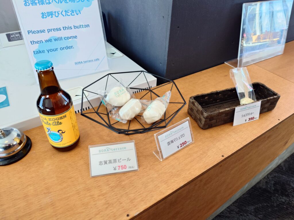 山頂エリアをある程度堪能し、ロープウェイ山頂駅へ戻ってきました。ロープウェイ山頂駅の真横にある「SORA terrace」という雲海や絶景が楽しめるテラスからの写真。天気が良て青空が広がり、素晴らしい景色を堪能できました。