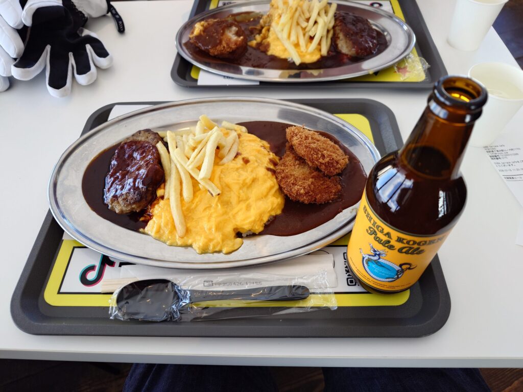 筆者が選んだのはわんぱく仕様の1日分のカロリープレート(2100円)と、志賀高原ビール(750円)。カロリープレートは真ん中にトロトロ卵とフライドポテト。右側にカツカレー、左側にハンバーグという、みんなが大好きであろうおかず達が大きなお皿の上で1つになっている、なんとも贅沢で欲張りなプレート。