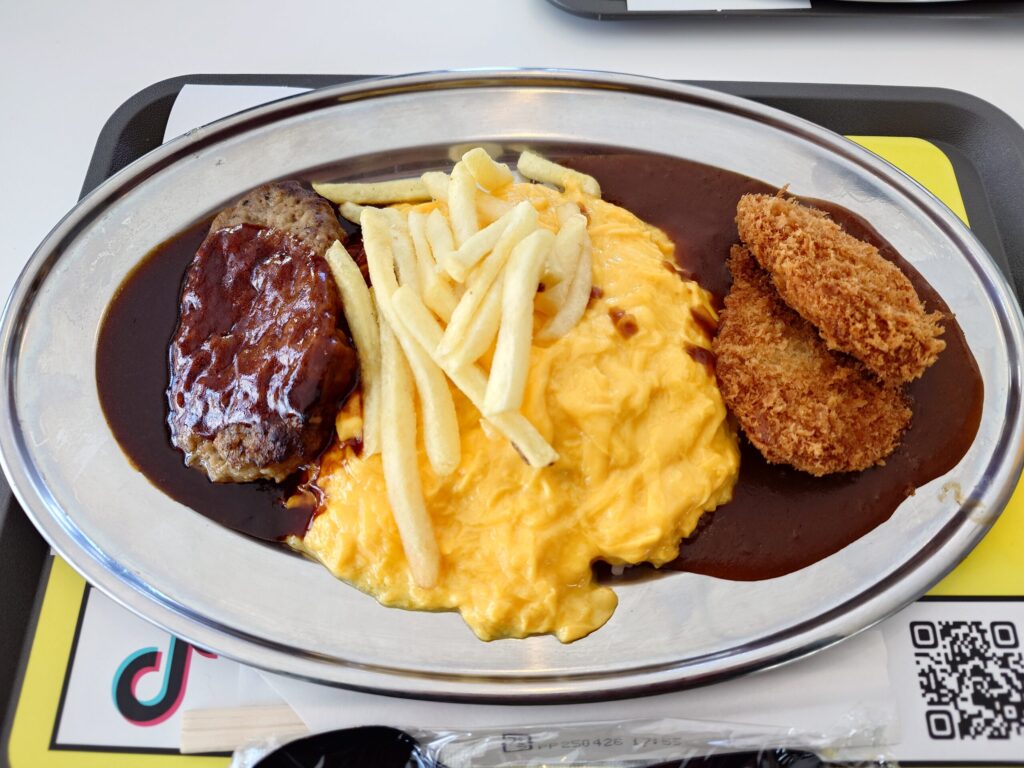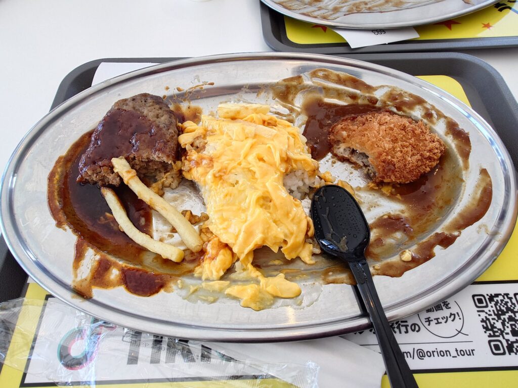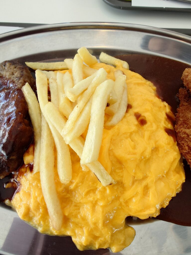 ポテトフライ・オムライス・カツカレー・ハンバーグと、色んな物をお腹いっぱいになるまで食べたい欲張りさんには最高のメニューだと思いました。