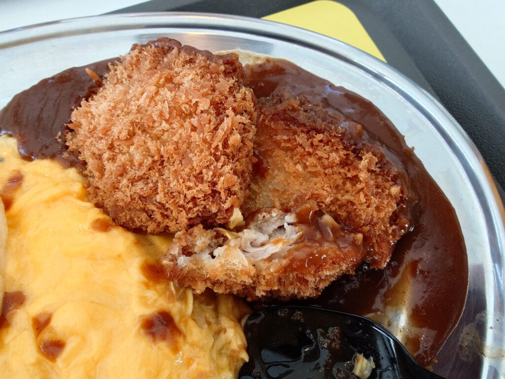 カツはサクサクで柔らかく、程よく脂がのっている。プラスチックのスプーンで簡単に切れるほどの柔らかさ。