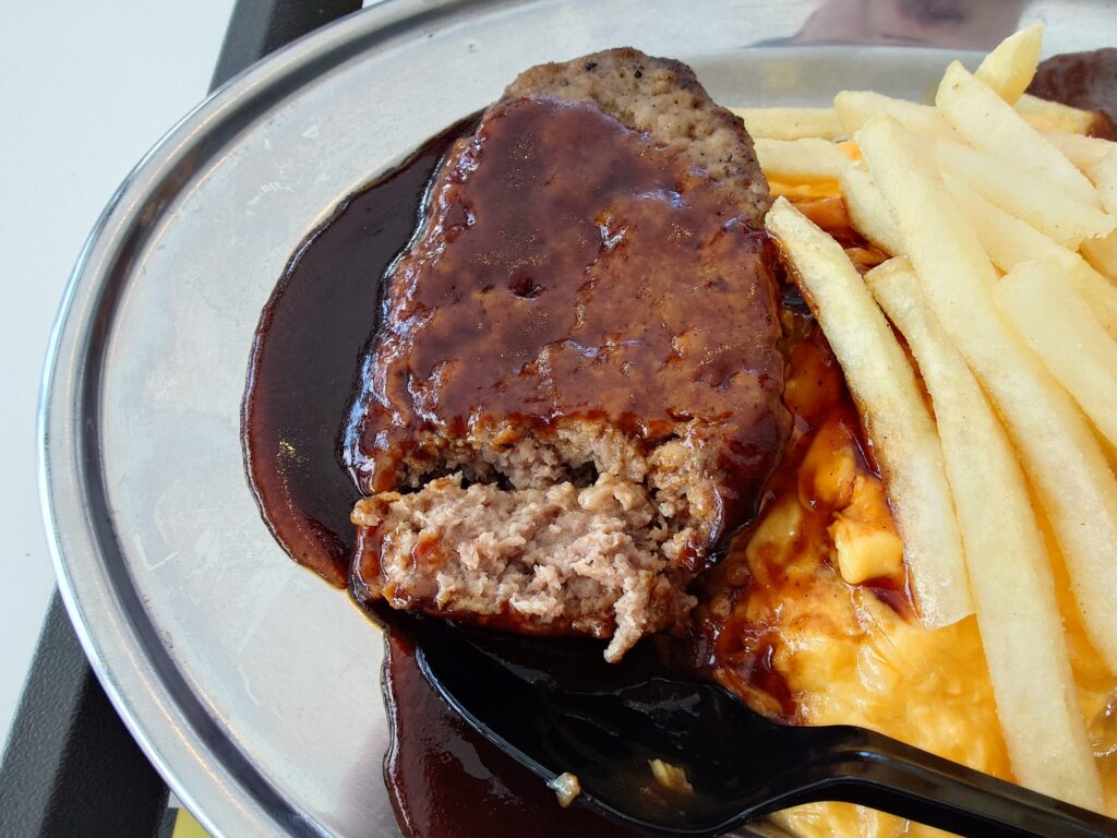 ハンバーグは見た目よりも分厚くて大きく肉肉しい。パサつきはなくてしっとりしている。