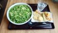ゴーヤと枝豆のかき揚げという旬の天ぷらもあります。筆者は名物の太そば(400円)、名物のジャンボゲソ天(330円)、人気のとり天(190)、おにぎり(130円)、いなり寿司(100円)を注文することにしました。