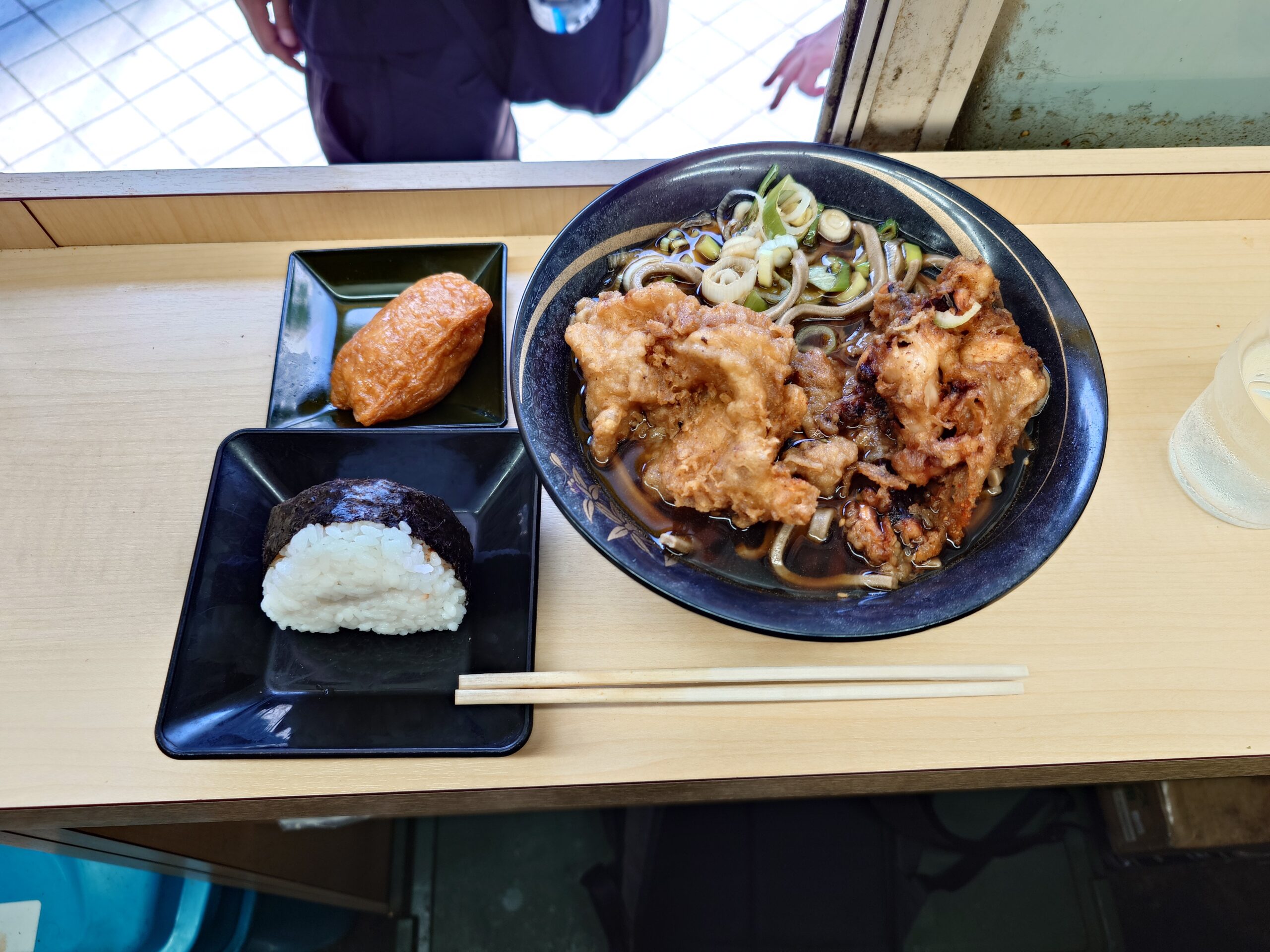注文したらすぐ出てきました。太そば(400円)にジャンボゲソ天(330円)と、とり天(190)をトッピング。そしておにぎり(130円)と、いなり寿司(100円)。